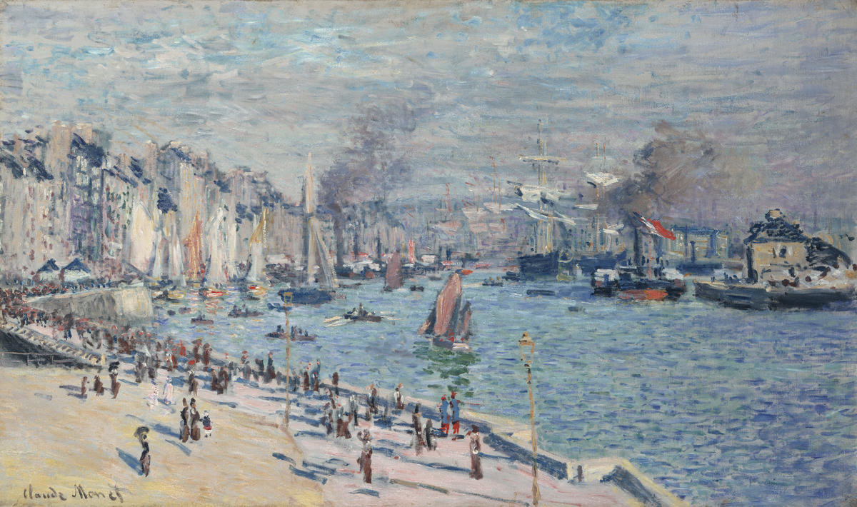 Claude Monet's view of the busy harbor of Le Havre is one of several paintings that he made when visiting the city in January 1874. Having lived in Le Havre as a child, he was familiar with the port and may have returned over the holidays in search of fresh material for paintings to exhibit with a newly organized group of independent artists. A recognizable view of the outer harbor and its array of sail-, steam-, and oar-powered ships, this painting was not included in the first independent exhibition of 1874. Instead, a less distinct view of the harbor was shown, which Monet titled Impression, Sunrise (Musée Marmottan, Paris); it was this title that led a bemused critic to dub the group the Impressionists. The short, blunt brushstrokes of Philadelphia's harbor painting have a nervous, fleeting quality that evokes the movement of water, boats, and people in the bright afternoon sunlight. Capturing a specific moment was critical to Monet's ambition; a related painting in the Los Angeles County Museum of Art shows an identical view of the harbor, but on a rainy day, when shimmering pools of water dotted the quay.