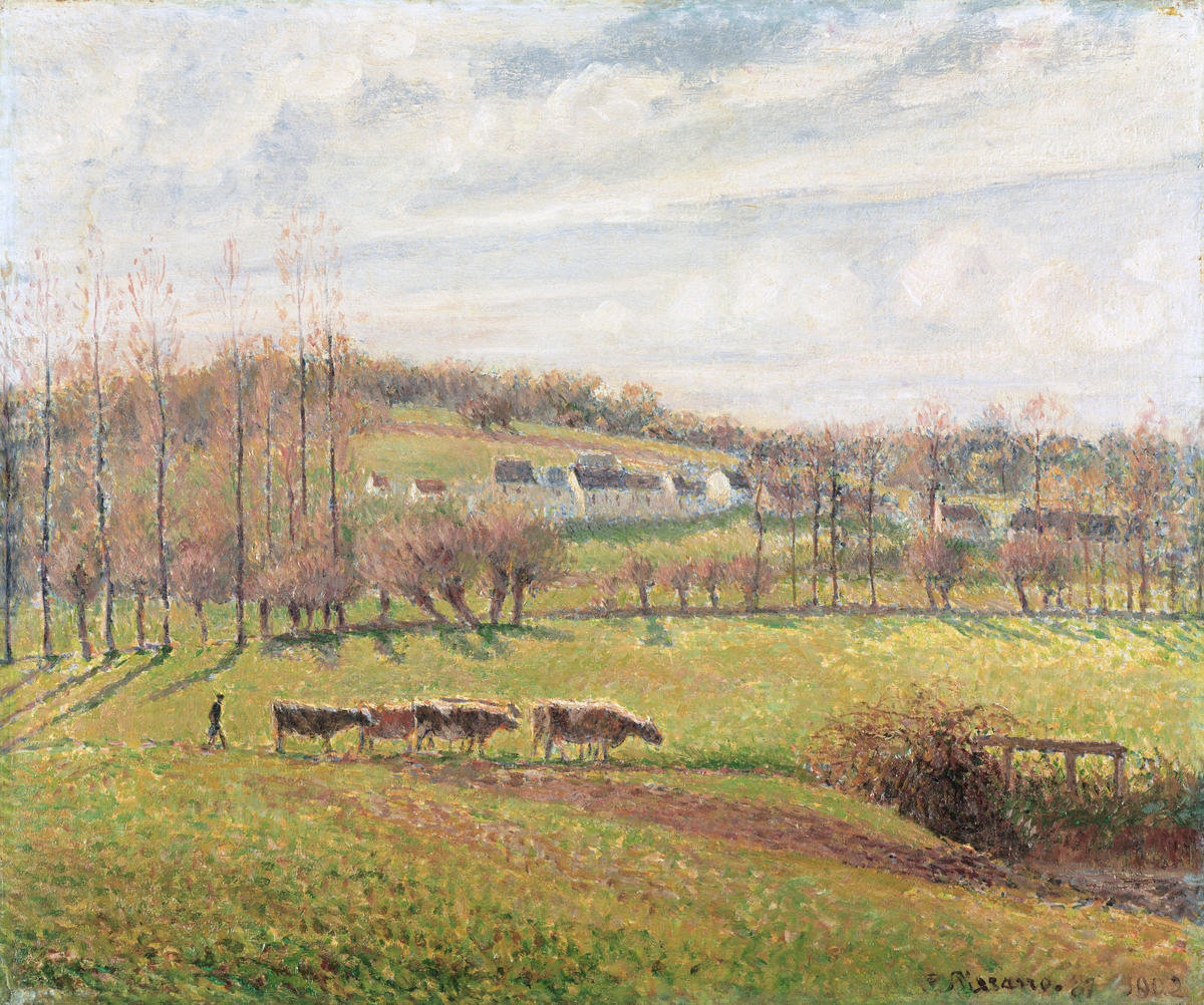 Influenced by the Pointillist work of Georges Seurat, Pissarro originally painted this landscape entirely in small dots of color and dated it [18]87 in the lower right corner. The work remained in Pissarro's studio where, several years later, the upper left of the canvas was torn. The artist repaired the work and added a second date of 1902. Because Pissarro had by then abandoned the Pointillist style, the repainted area of the painting—the sky—exhibits the looser, more Impressionistic style of his later years.