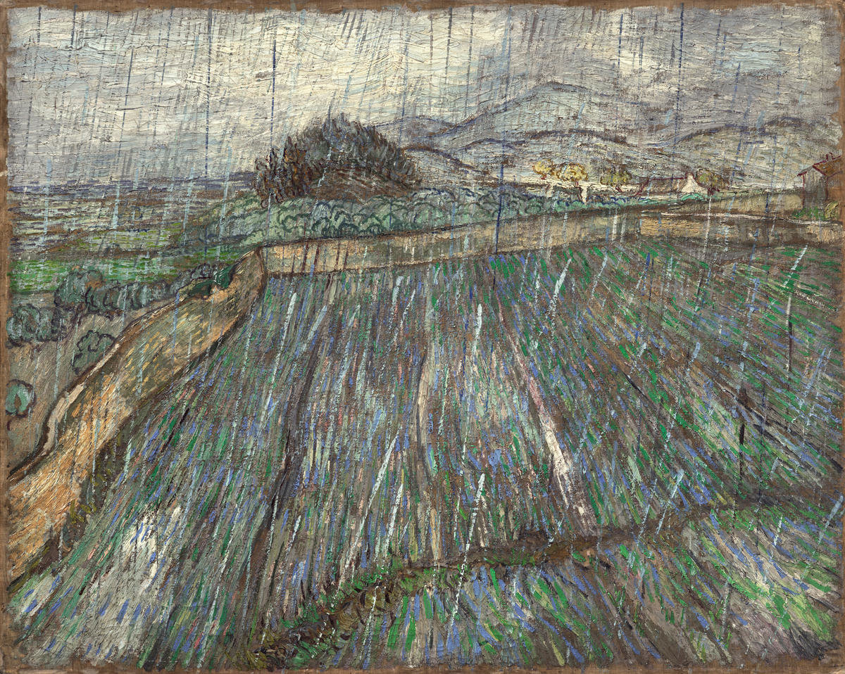Van Gogh painted Rain while he was a patient at the hospital of Saint-Paul de Mausole in Saint-Rémy, a small town near Arles. He entered the facility in May 1889 in search of help for his emotional problems. He had a private room as well as a studio. From his room van Gogh could look down on the wheatfield depicted in Rain. During his eleven-month stay van Gogh drew and painted this view about a dozen times, experimenting with the shifting light effects and weather changes he observed through the seasons. This is the only painting he made of this field in the rain. Although he was looking through bars on the window when he composed this