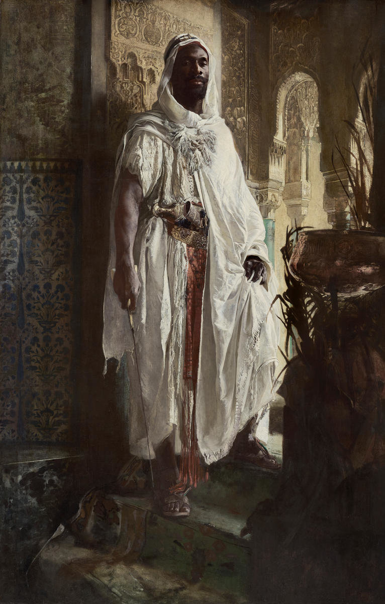 Eduard Charlemont used studio props and a paid model to evoke a world of luxury and power and an architectural setting that resembles the Islamic palace of the Alhambra in Granada, Spain. (The canvas was once called The Alhambra Guard.) This work demonstrates the romantic lens through which white Europeans regarded the traditions, peoples, and places of Muslim Spain and the French colonies in West Africa. Although Charlemont painted few African subjects and was best known for portraits and depictions of European historical subjects, his singular ability to convey a model’s personality and to suggest different textures and surfaces is evident here. The name of the model who posed for this commanding figure standing in a palace doorway may never be known. The artist had recently come to Paris from Vienna and was little known when he exhibited this work to great acclaim at the 1878 Paris Salon.