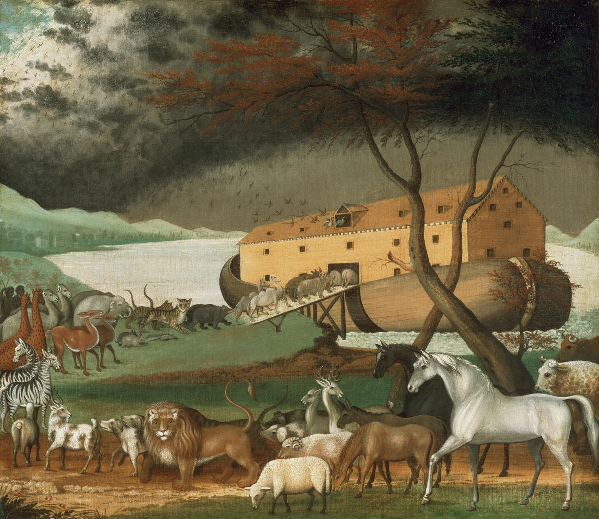 This painting by Edward Hicks shows a long, curving line of animals approaching Noah’s huge boat. Prancing horses and a serious-looking lion stare out at us, while pairs of elegant, black-and-white-striped zebras, giraffes, camels, tigers, and hippopotamuses stand patiently. In the distance, tiny black birds fly down from the dark, rain-filled clouds overhead.