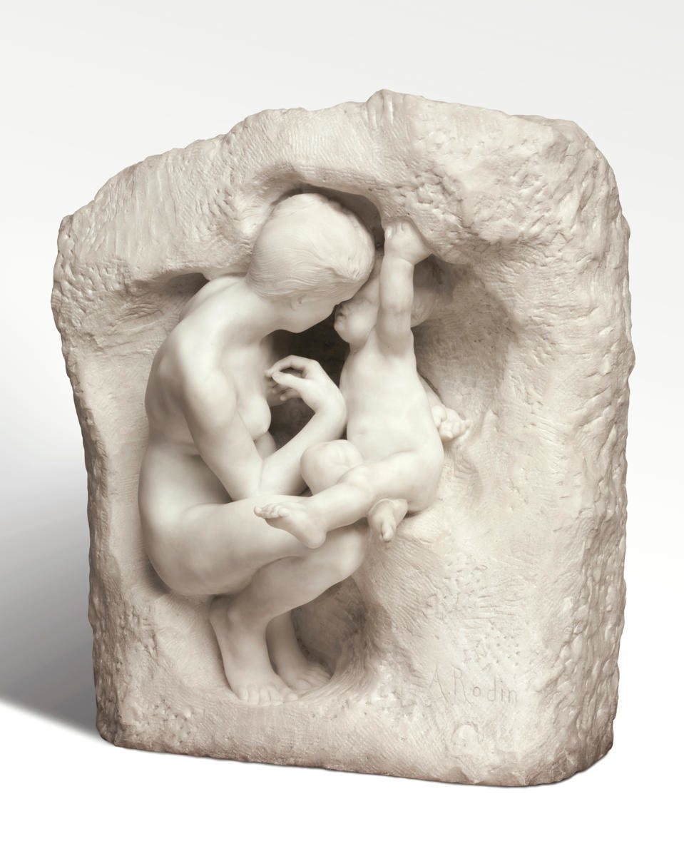 Auguste Rodin’s marble Young Mother in a Grotto is related to a mother-child pair found on the left panel of the Gates of Hell. The woman, crouching in a grotto and shielding her child from the elements, seems to embody maternal love and protection. The contrasting textures of the smooth figures against the rough grotto highlight the way the human forms magically emerge from the living stone in a deeply primordial way, something that Rodin learned from Michelangelo. The theme of maternal love is much less prevalent in Rodin’s work than love between man and woman. A similar work was titled both Young Mother and Woman and Love, and Rodin gave many of his drawings on the theme mythological titles. Is the baby on her knee her own child, or the personification of love, Eros?