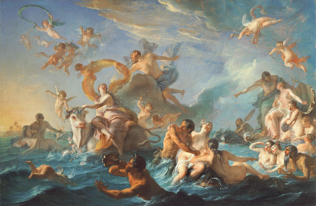 According to the story told in Ovid's Metamorphoses, the god Jupiter, smitten with the nymph Europa, transformed himself into a white bull and abducted her. Here Jupiter swims away with Europa on his back attended by a host of sea deities. Celebrated since it was entered in a royal painting competition in 1727, this picture has been in Philadelphia since 1815. It belonged to Joseph Bonaparte, who lived here in exile following the fall of his brother, the emperor Napoleon.