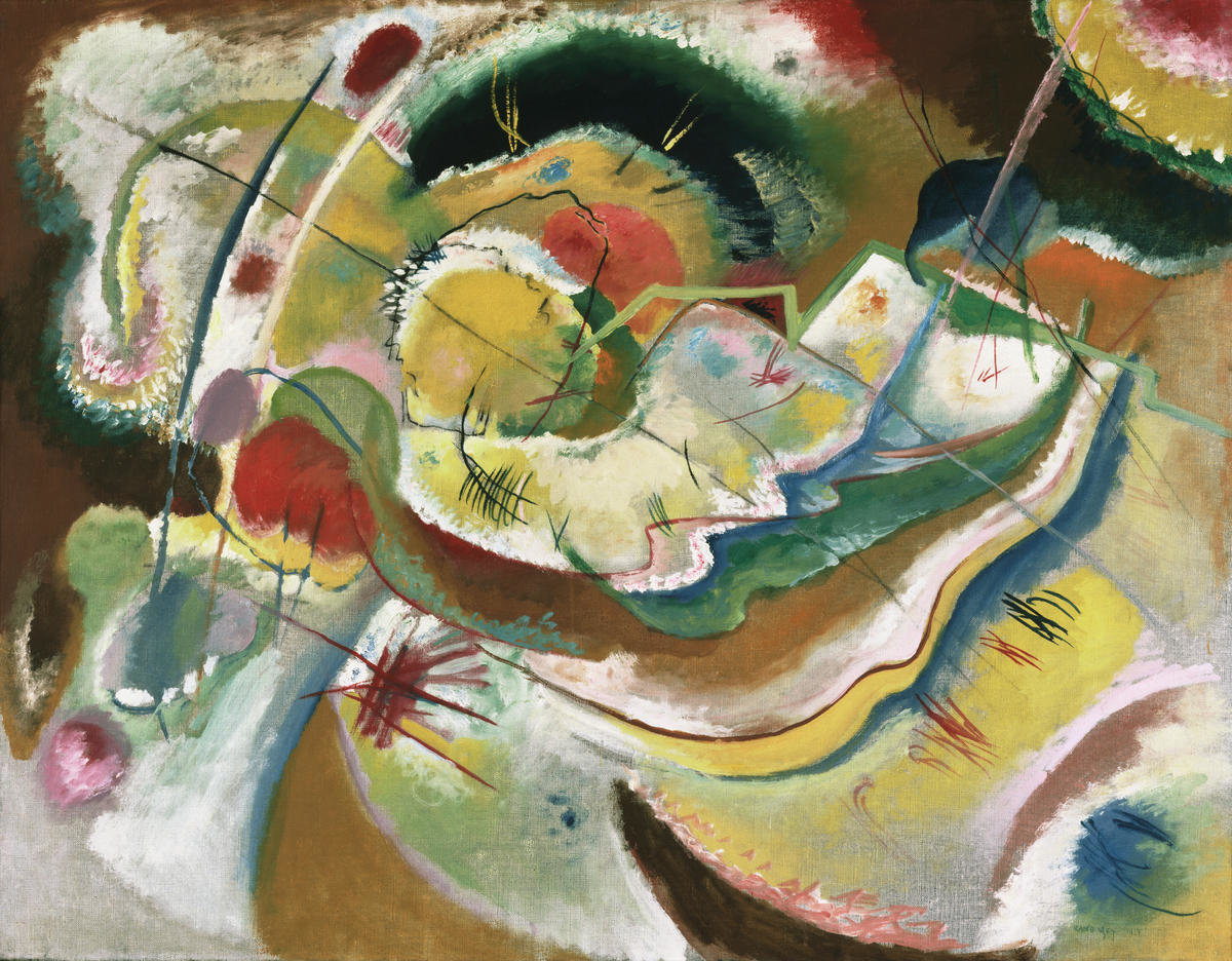 Wassily Kandinsky's statement that "painting is like a thundering collision of different worlds that are destined in and through conflict to create that new world called the work" finds colorful expression in this dynamic painting, in which blue, red, and green lines intersect with large areas of yellows, purples, and pinks. One of the founders of Der Blaue Reiter (The Blue Rider), a group of Expressionist artists in Munich, Kandinsky was among the first painters to produce abstract works, which he called Improvisations. Inspired by the relationship between music and painting, he valued shapes, lines, and colors as carriers of spontaneous emotional and spiritual expression. Kandinsky created Little Painting with Yellow in Munich just before the outbreak of World War I, which forced him to return to Russia. No doubt affected by the increasingly unstable political environment and his belief in the imminence of the Apocalypse, he painted a whirlwind of explosive lines and colors that suggest both the terror of catastrophe and the elation of rebirth. In his influential essay Concerning the Spiritual in Art (1911), Kandinsky linked certain colors with emotions and sounds. Little Painting with Yellow is a moving combination of repeating rhythmic forms, colorful harmonies, and jarring dissonances.