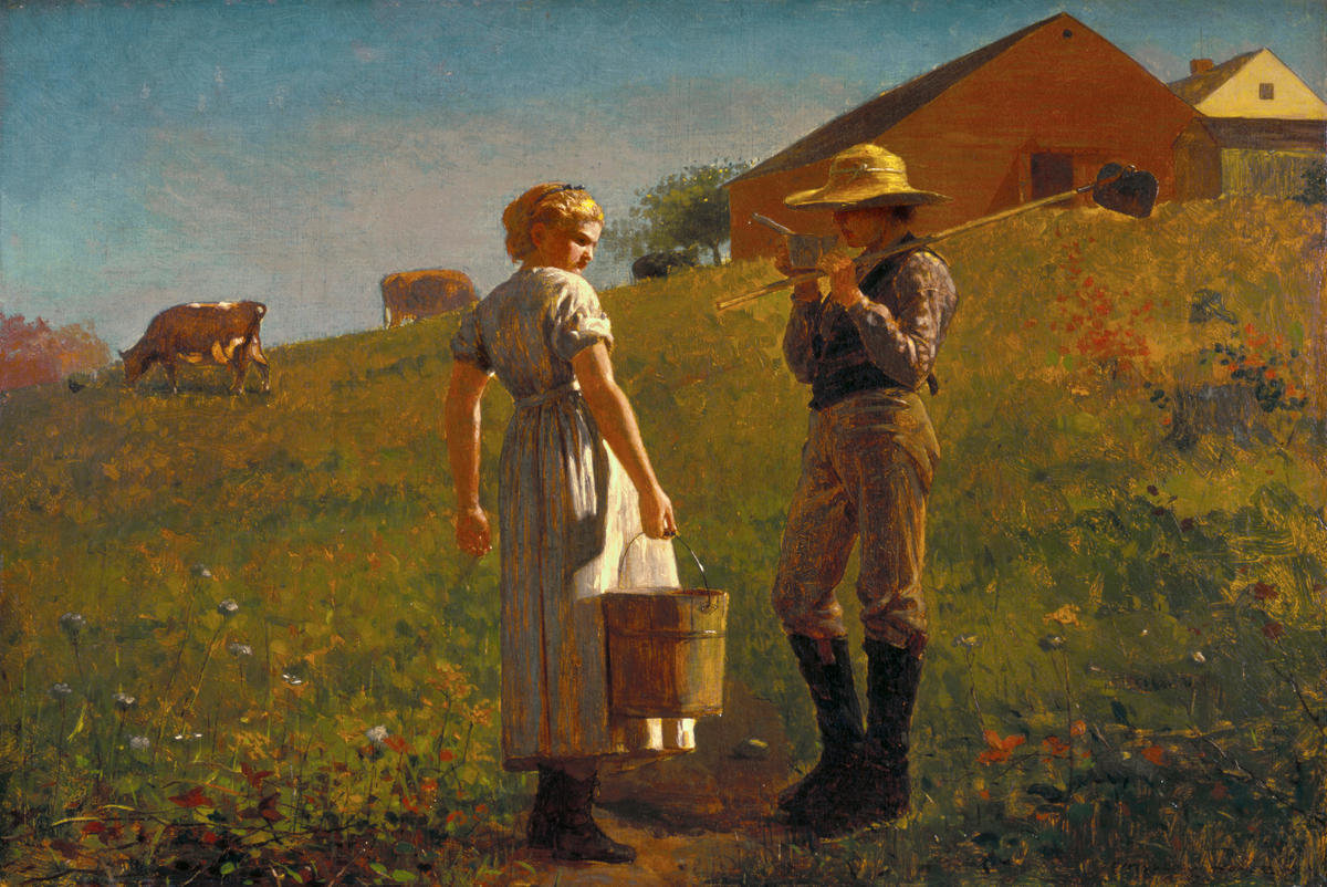 Homer's painting cleverly refers to the rising American temperance movement, a crusade against drinking alcohol, by depicting a stout milkmaid pausing while a farmhand drinks from her ladle. Swaying under the weight of her pail and squinting into the sun, she presents the ideal of natural womanhood. Her powerful presence, marked by broad shoulders, muscular arms, and sunburned skin, counters the farmhand's relaxed stance and shaded face, visually reversing traditional gender roles. Far from flirting, the two figures awkwardly avoid each other's gaze, modeling rural wholesomeness and rectitude.