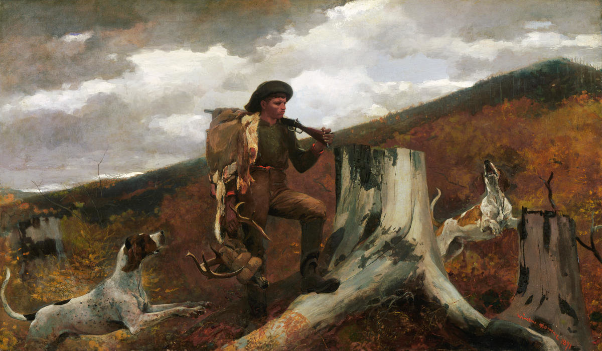 Unlike most of his contemporaries, Winslow Homer did not have academic training in Paris, and he also remained aloof from Impressionist and various other artistic trends. However, his personal interest in recreational hunting and fishing and in natural scenery coincided with the growing nostalgia for the American wilderness and rural life that accompanied the increasing urbanization of the United States in the late nineteenth century, and Homer became one of the period's most popular and successful artists. Based upon studies he had made during fishing trips to the Adirondacks, Huntsman and Dogs is characteristic of his unsentimental view of the conflict of humans and animals in a vast, overwhelmingly powerful natural world. In this overcast, late autumn landscape, only the hunter and his dogs are alive. All else is dead, the result of the inexorable working of the seasons and the depredations of humankind. The energetic movement of the barking dogs emphasizes both the hunter's isolation and his kinship with the silent, immutable landscape. Darrel Sewell, from Philadelphia Museum of Art: Handbook of the Collections (1995), p. 291