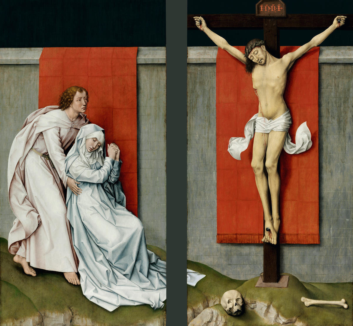 The greatest old master painting in the Museum, Rogier van der Weyden's diptych presents the Crucifixion as a timeless dramatic narrative. To convey overwhelming depths of human emotion, Rogier located monumental forms in a shallow, austere, nocturnal space accented only by brilliant red hangings. He focused on the experience of the Virgin, her unbearable grief expressed by her swooning into the arms of John the Evangelist. The intensity of her anguish is echoed in the agitated, fluttering loincloth that moves around Christ's motionless body as if the air itself were astir with sorrow. Rogier's use of two panels in a diptych, rather than the more usual three found in a triptych, is rare in paintings of this period, and allowed the artist to balance the human despair at the darkest hour of the Christian faith against the promise of redemption.