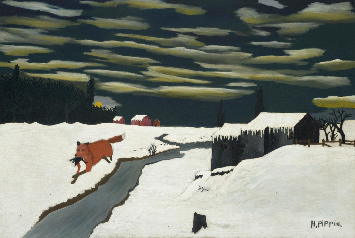Pippin began The Getaway as a daytime scene with a blue sky, red barns, and a fox standing still in the snow. His inspiration to transform the work into a nighttime setting may have come from seeing Winslow Homer’s Fox Hunt at the Pennsylvania Academy of the Fine Arts in Philadelphia. In Homer’s painting, the fox is pursued by crows and appears to be running for its life. In Pippin’s snowy portrayal, the fox has captured a bird and escapes in the moonlight.