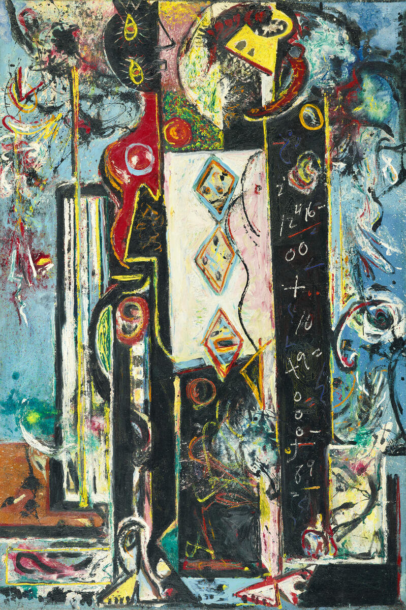 In November 1943 this painting was included in Jackson Pollock's stunning solo exhibition at Art of This Century, the innovative New York art gallery run by legendary art patron Peggy Guggenheim. As its title suggests, the work depicts a male figure, embodied in the black columnar form at right, with its mysterious arithmetic graffiti, and a curvy female figure at left, with marvelous catlike eyelashes. Standing on tiny triangular feet, both figures are surrounded by splashed and smeared oil paint that enhances the sense of energy inherent in the two vertical forms, while also foreshadowing the famous "drip" technique that Pollock would develop later that decade.