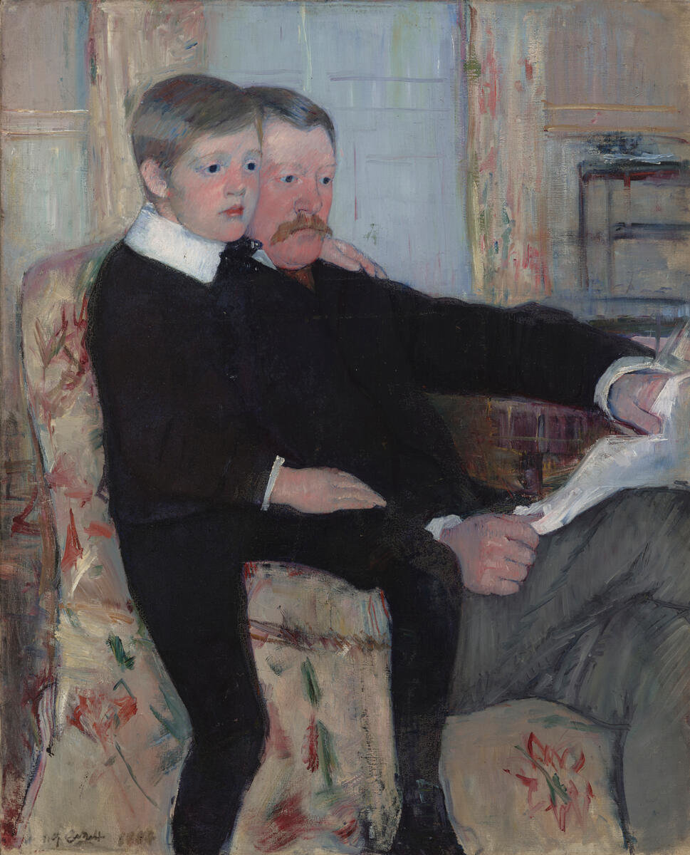 In December 1884, Alexander Cassatt and his son Robert paid a surprise visit to Paris to see Alexander’s parents and his sister, the painter Mary Cassatt. During the monthlong holiday, father and son sat for a tender double portrait that emphasizes their bond and physical resemblance. With similarly focused gazes, flushed cheeks, and black clothing that connects them in an embrace, parent and child are caught in a private moment.