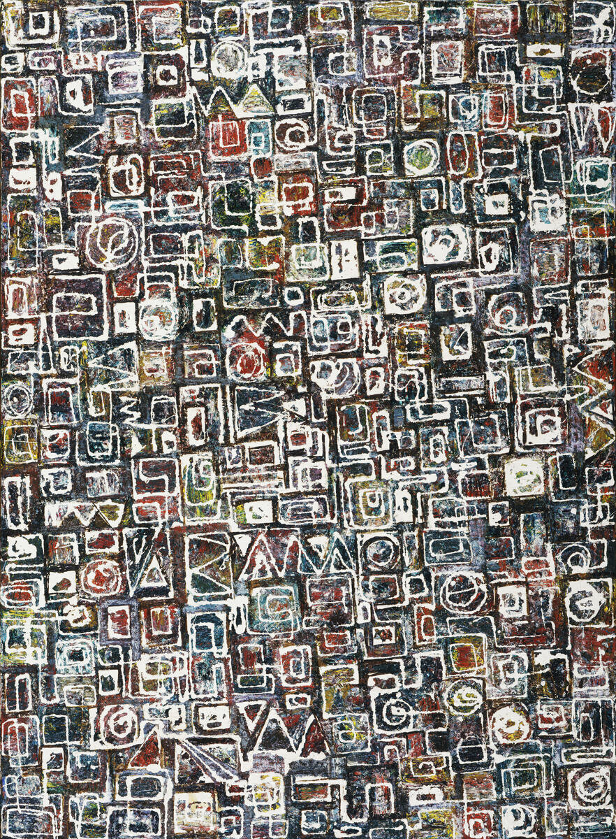 Composition comes from Lee Krasner’s breakthrough series of “Little Image” paintings of the late 1940s. Meticulously crafted and intimately scaled, it reflects her deft control of innovative, unorthodox painting methods. Krasner—the wife of Jackson Pollock, one of the most celebrated artists in the postwar period—worked the canvas flat on a table, applying pigments with sticks and palette knives or straight from the tube. The picture’s overlapping skeins of dripped white paint form small, geometric compartments and convoluted designs atop a densely textured surface. Although seemingly impenetrable and unreadable, Composition celebrates painting as a primal means of communication through an analogy to picture-based writing systems.